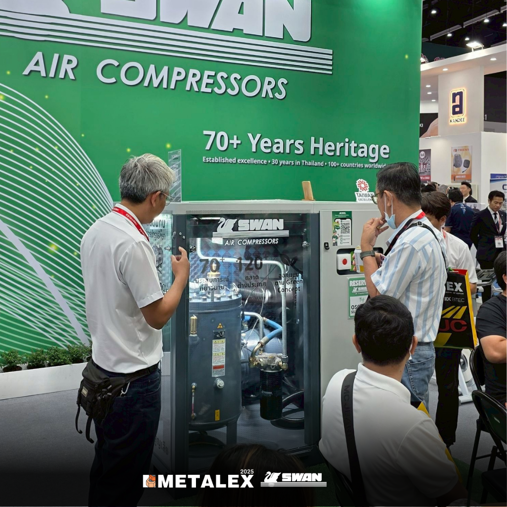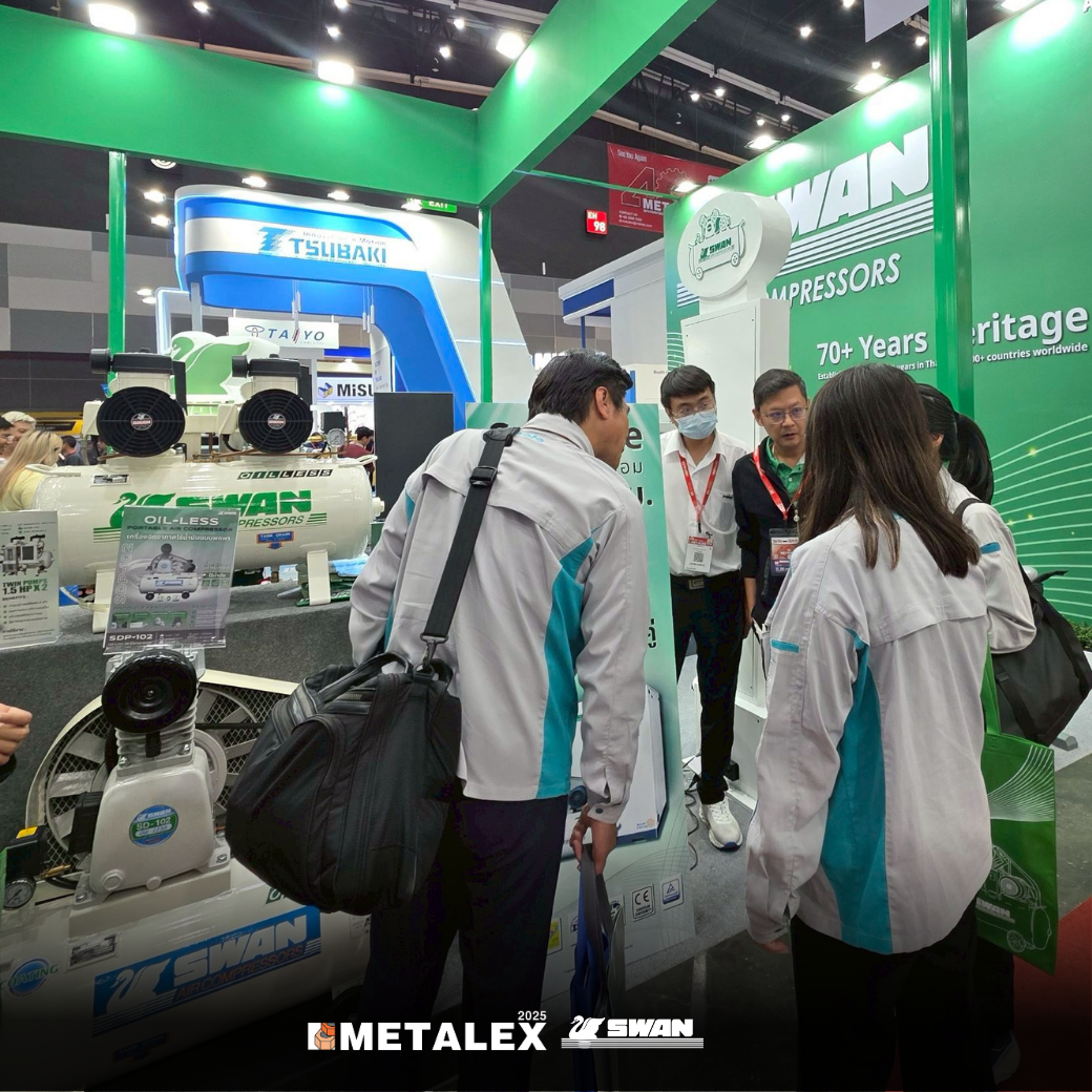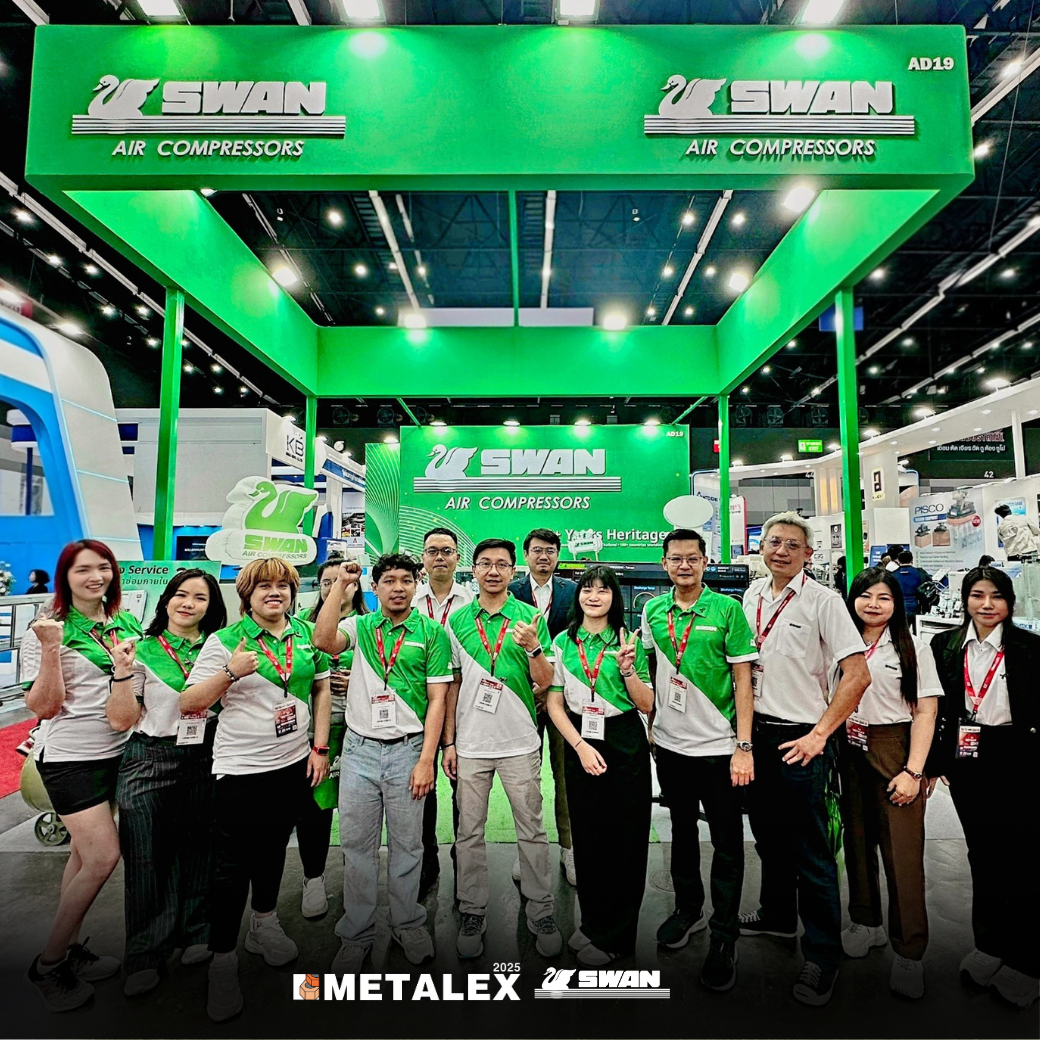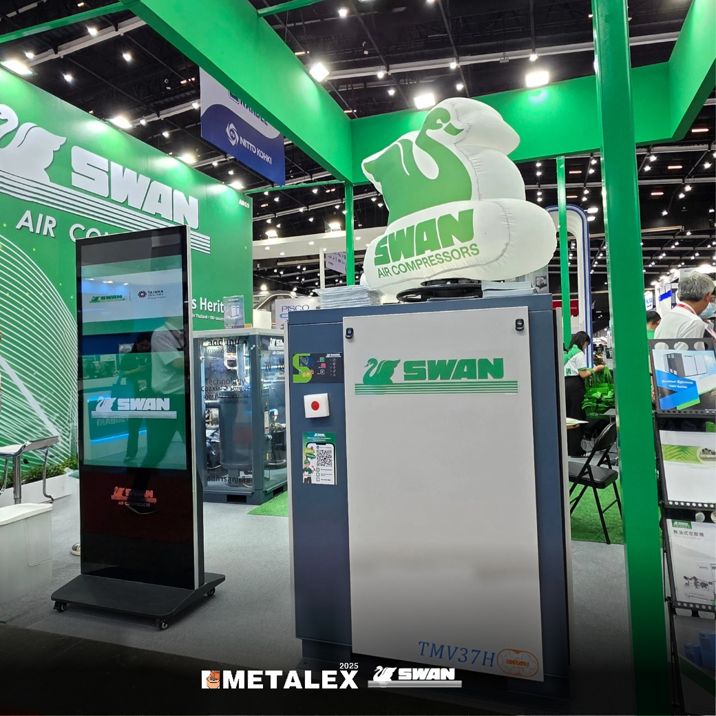 ในปีนี้ SWAN ได้เข้าร่วมงาน METALEX 2025 งานที่ได้รับการยอมรับว่าเป็นมหกรรมเครื่องจักรและเทคโนโลยีโลหการที่ใหญ่ที่สุดของอาเซียน ซึ่งจัดขึ้นระหว่างวันที่ 19 - 22 พฤศจิกายน 2568 ณ ศูนย์แสดงสินค้าไบเทคบางนา กรุงเทพ ภายใต้แนวคิด “Solidify Your ECO Power Energy Saving Air Compressor” ผ่านโทนสีเขียว–ขาวซึ่งเป็นอัตลักษณ์ของ SWAN โดยการออกแบบภายในบูธจะสะท้อนภาพลักษณ์ในด้านเทคโนโลยีเครื่องอัดอากาศและความยั่งยืนด้านสิ่งแวดล้อม พร้อมดีไซน์โค้งเว้าของลมสีทอง และยังมีการจัดแสดงเครื่องอัดอากาศที่เปิดเดินเครื่องจริงให้ผู้เข้าชมได้ฟังเสียงการทำงาน สัมผัสแรงลม และการค่าการใช้พลังงานบนหน้าจอแบบทันที รวมถึงมีโซนกิจกรรมผลิตพลังงานจากการปั่นจักรยานที่ช่วยให้ผู้เข้าชมเห็นความสำคัญของการประหยัดพลังงานอย่างเป็นรูปธรรม