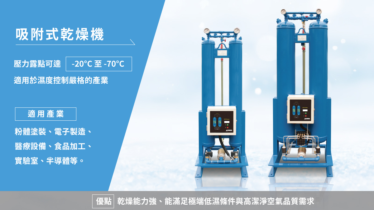 當經冷凍式乾燥機處理的壓縮空氣仍不足以滿足產線乾燥用氣需求時,常使用吸附式乾燥機作為強化處理設備。