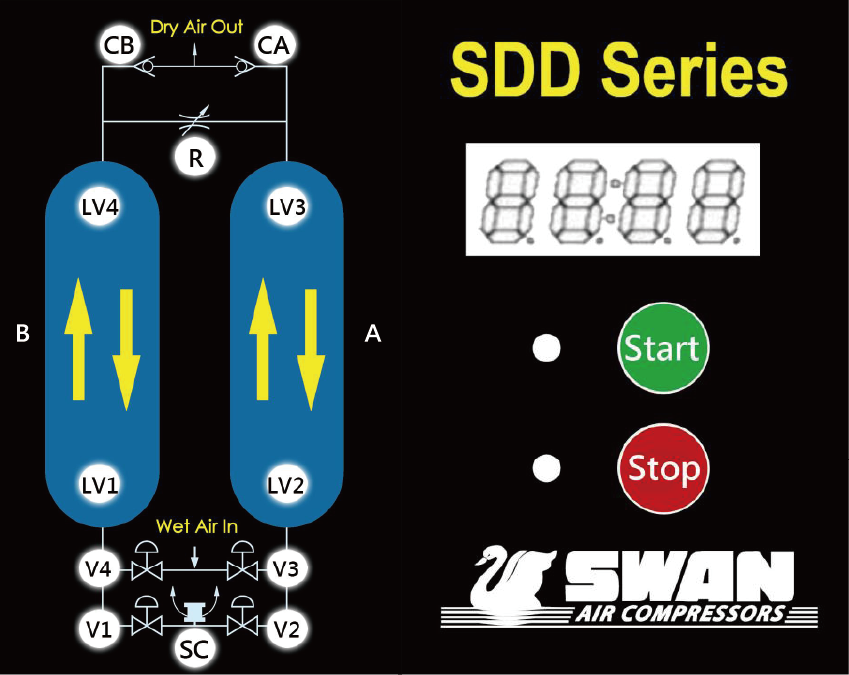 SWAN uses the characteristics of molecular sieves and activated alumina to fill the adsorption dryer in an appropriate ratio to deal with possible changes in the pressure and water content of the compressed air, and achieve the set dew point quality.