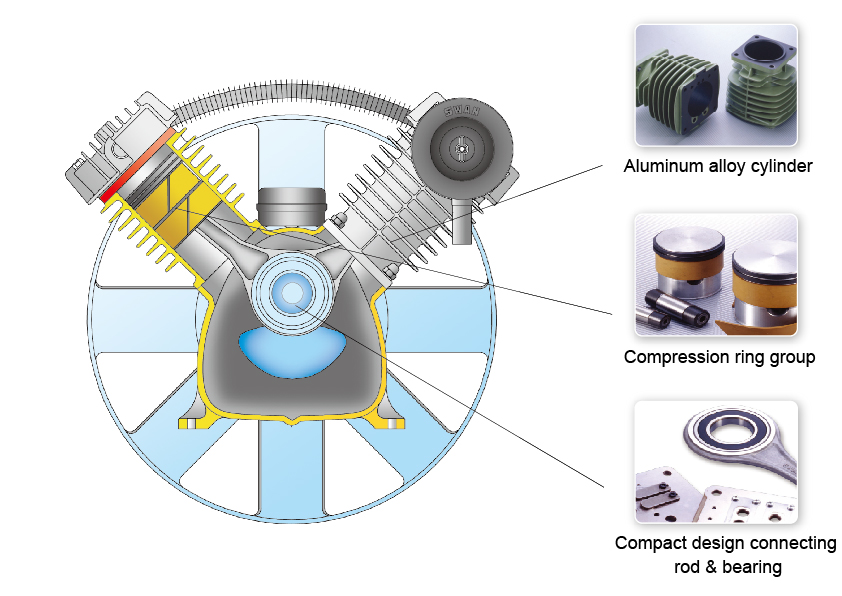 High-strength, high-precision, high-reliability component mechanism, 5V type belt and simple belt adjustment mechanism effectively extends running life of the air compressor.