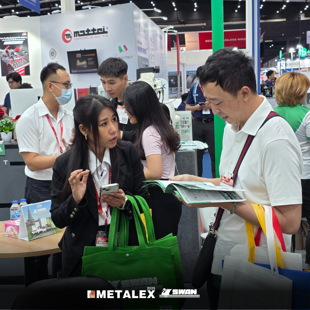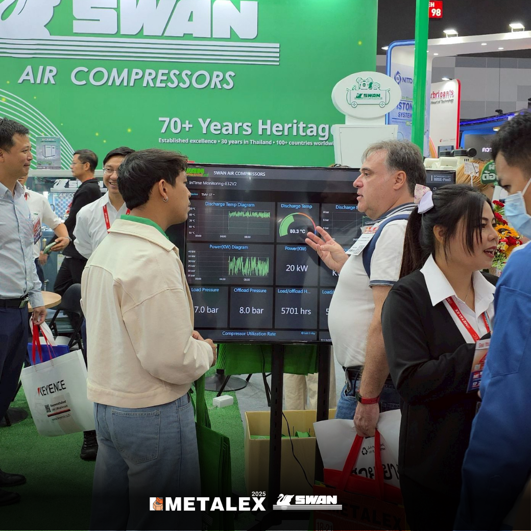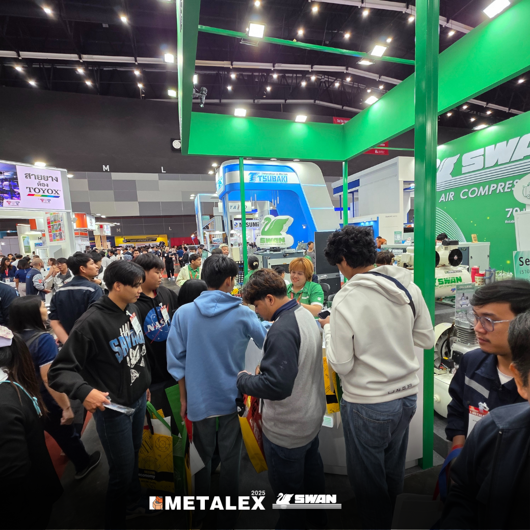 ในปีนี้ SWAN ได้เข้าร่วมงาน METALEX 2025 งานที่ได้รับการยอมรับว่าเป็นมหกรรมเครื่องจักรและเทคโนโลยีโลหการที่ใหญ่ที่สุดของอาเซียน ซึ่งจัดขึ้นระหว่างวันที่ 19 - 22 พฤศจิกายน 2568 ณ ศูนย์แสดงสินค้าไบเทคบางนา กรุงเทพ ภายใต้แนวคิด “Solidify Your ECO Power Energy Saving Air Compressor” ผ่านโทนสีเขียว–ขาวซึ่งเป็นอัตลักษณ์ของ SWAN โดยการออกแบบภายในบูธจะสะท้อนภาพลักษณ์ในด้านเทคโนโลยีเครื่องอัดอากาศและความยั่งยืนด้านสิ่งแวดล้อม พร้อมดีไซน์โค้งเว้าของลมสีทอง และยังมีการจัดแสดงเครื่องอัดอากาศที่เปิดเดินเครื่องจริงให้ผู้เข้าชมได้ฟังเสียงการทำงาน สัมผัสแรงลม และการค่าการใช้พลังงานบนหน้าจอแบบทันที รวมถึงมีโซนกิจกรรมผลิตพลังงานจากการปั่นจักรยานที่ช่วยให้ผู้เข้าชมเห็นความสำคัญของการประหยัดพลังงานอย่างเป็นรูปธรรม