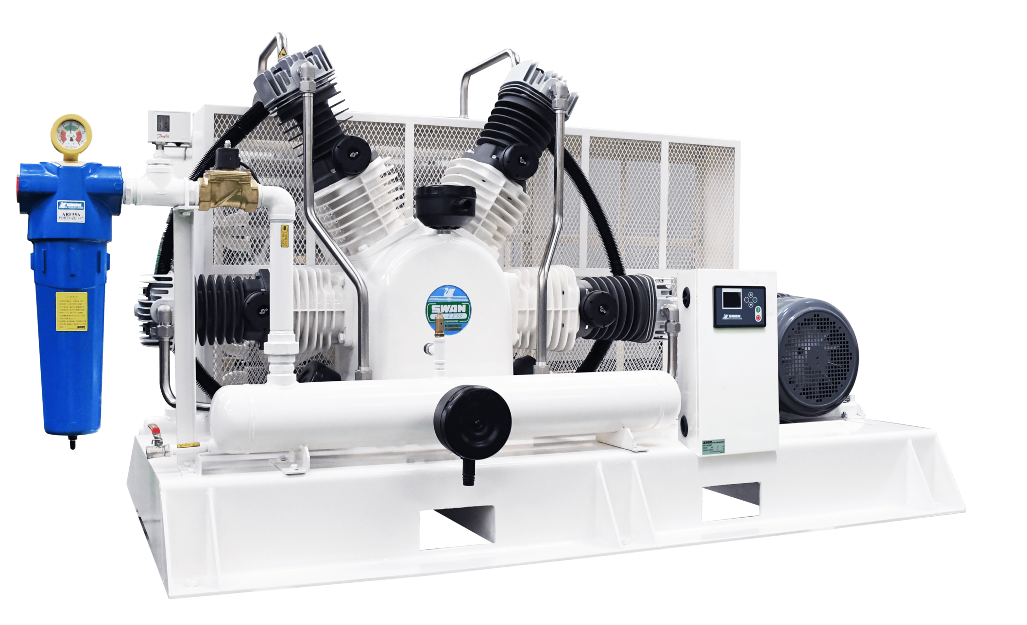 - 採用不鏽鋼儲氣桶及管材,三具壓縮機組循序啟動與獨立電流保護裝置,確保長期使用依然潔淨可靠