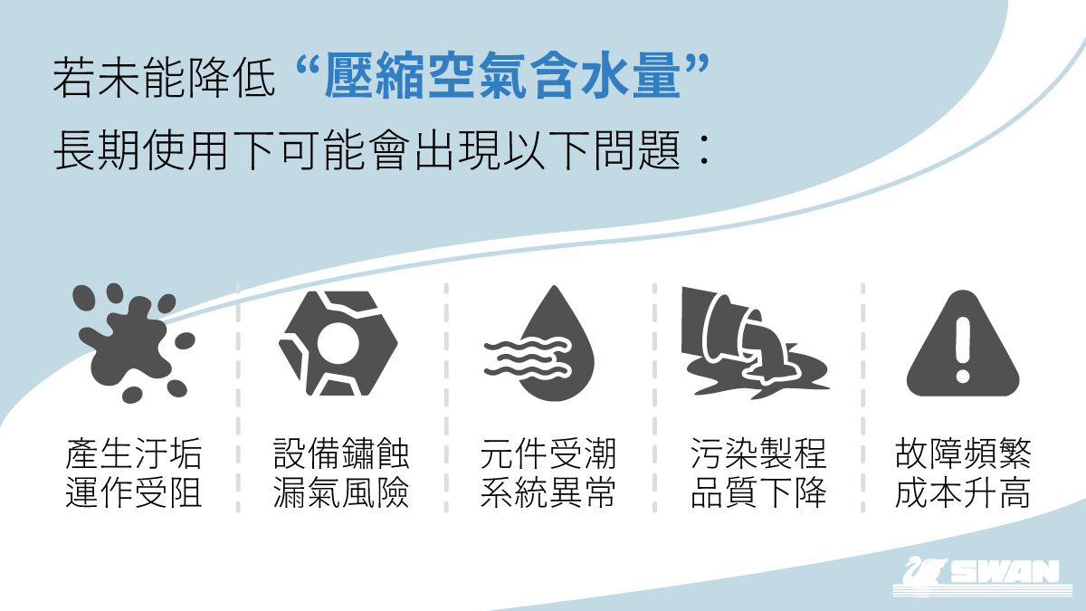 若未能降低壓縮空氣含水量,長期使用下可能會出現以下問題: