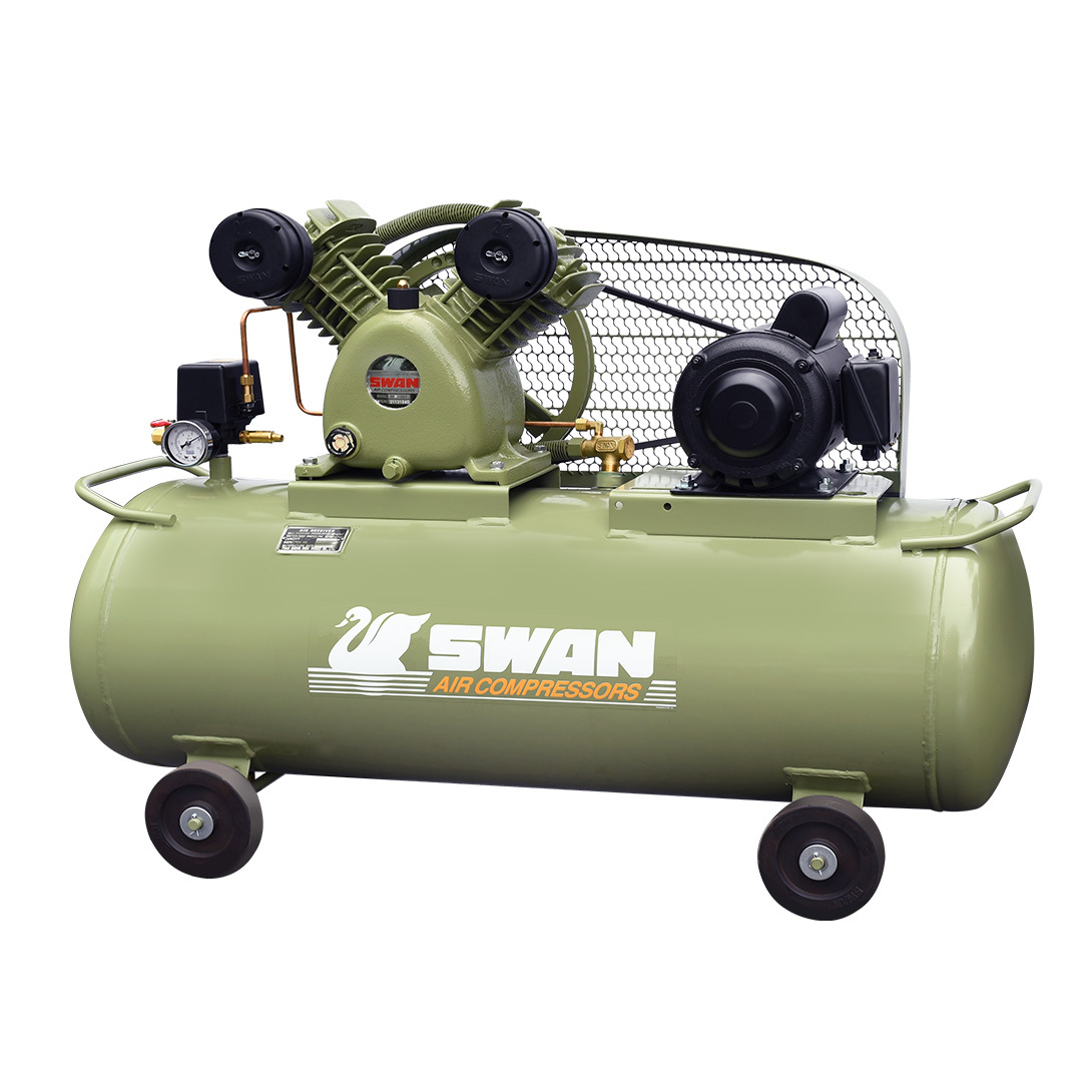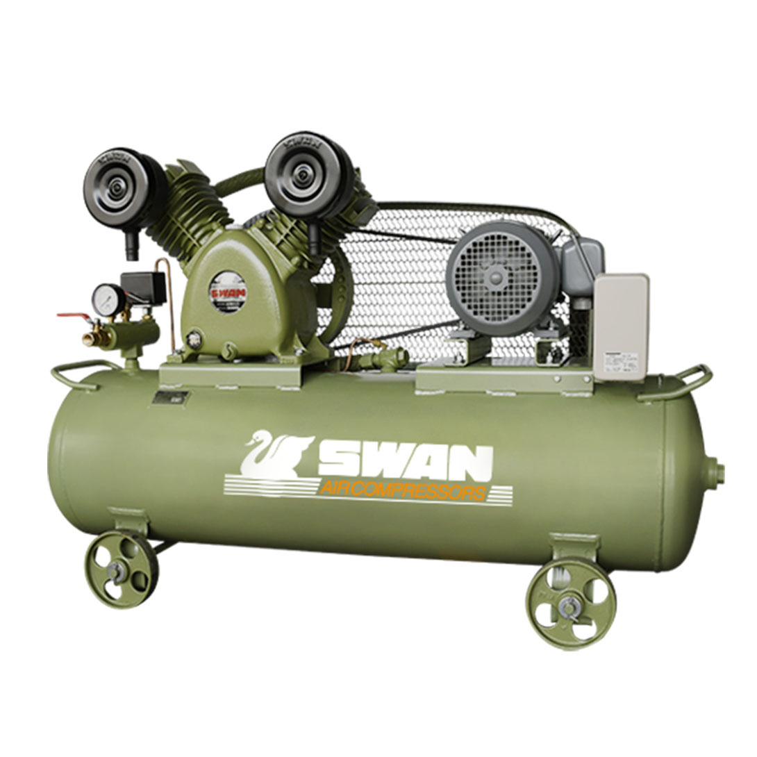Dòng máy nén khí SWAN hệ S lượng khí ra cao, bình khí lớn; bảo vệ mất dầu bôi trơn bắt buộc, sử dụng bền tuổi thọ dài, bình khí sơn tĩnh điện, chống rỉ và bền lâu.